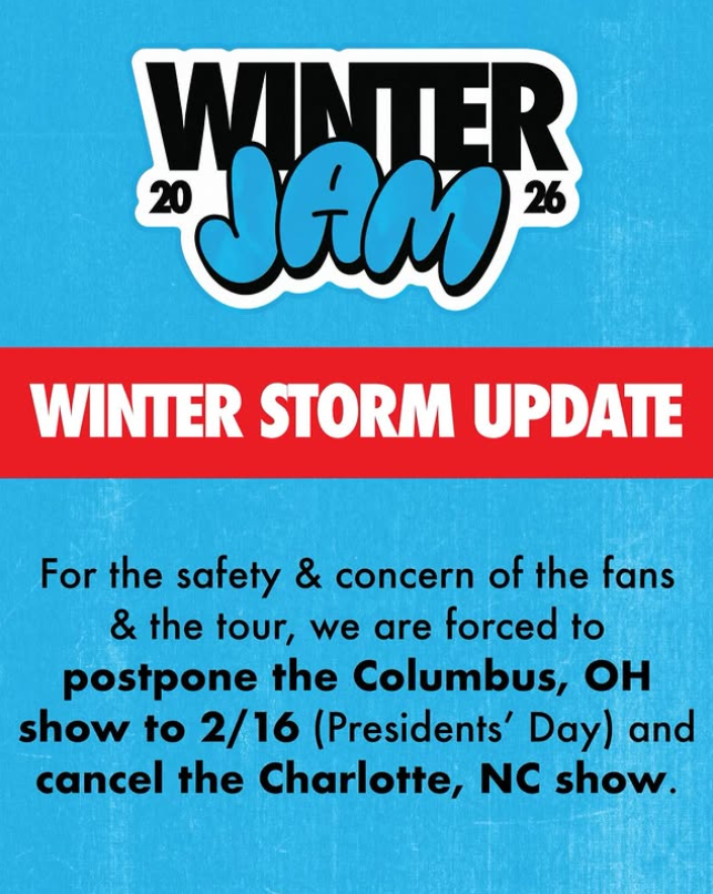 BREAKING NEWS: WinterJam 2026 will be postponing the Columbus, OH show to Monday, February 16 to avoid safety concerns regarding the winter storm warning this weekend. Stay warm. Stay safe.
