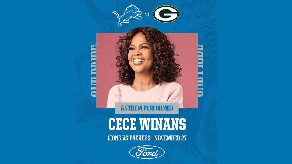 If you love Gospel music and football, you have a special treat awaiting for you! CeCe Winans will be performing the National Anthem at the Detroit Lion vs the Green Bay Packers game on Thursday, November 27th, which is the day of Thanksgiving!